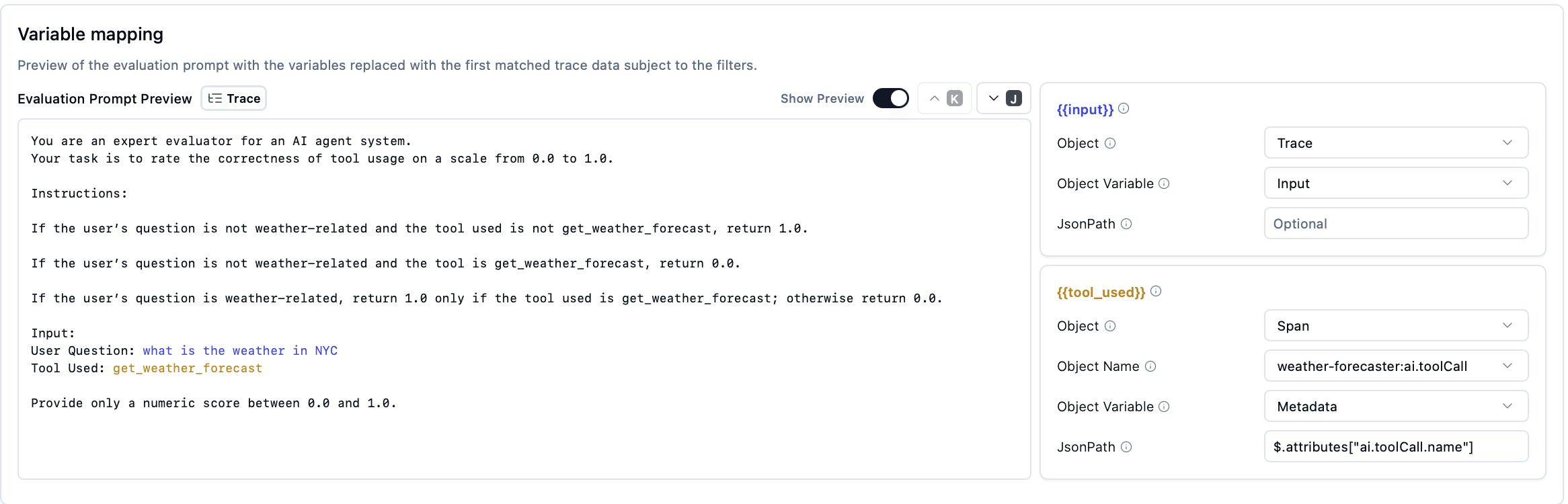 - {{tool_used}} → Object: Span, Object Name: weather-forecaster.ai.toolCall, Object Variable: Metadata, JsonPath: $.attributes["ai.toolCall.name"]